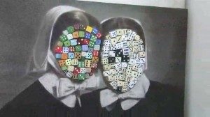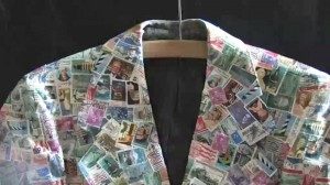 – une autre autre modalité, dont le caractère ornemental dissimule la nature essentiellement paradoxale, consiste à utiliser ces objets comme des ornements : en en remplissant, par exemple, des tissus à motifs de damiers, selon la couleur imposée par l’imprimé ; en s’en servant pour recouvrir des vestes (de timbres pour le facteur, de pin’s pour le collectionneur, d’allumettes pour le pompier, de pièces pour l’avare, …) ; en utilisant des fers à chaussures pour composer des motifs de tapis, ou des brosses et des équerres d’école pour faire une composition décorative ; en utilisant des drapeaux essentiellement pour leurs qualités colorées et plastiques, en tenant à peine compte de leur caractère symbolique