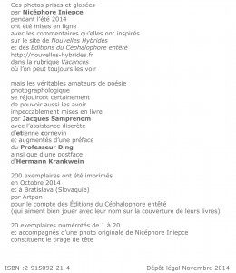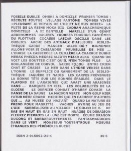 – comme d’habitude, en échange de 30 € que vous pourrez par exemple donner en mains plutôt propres au camarade éditeur en personne (et même en grand-père sonné) lors du Salon de l’Autre Livre, le ouikainde en kainze (voir annonce dans la rubrique À geindre, Da, Da), ou encore envoyer par chèque aux Éditions du Céphalophore entêté 84 rue Montaigne 36000 CHÂTEAUROUX, ou bien par paypal incessamment soupeu (je signale tout de suite aux amis de Belgique que les Éditions seront représentées aux « Fugueurs du Livre » à Liège les 6 et 7 décembre, et au Salon du livre d’artiste à Bruxelles les 28 février et 1er mars)